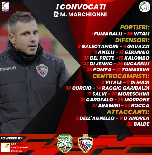 Non convocati per la trasferta di Monopoli, Federico Gentile, che usufruisce di alcuni giorni di riposo concessi dalla società, dopo i fatti di dieci giorni fà, oltre agli infortunati Agostinone, sulla via del rientro, ed a Di Stasio, Ndiaye, Spadoni e Regoli. Non convocati infinte, Mascolo, Sarracino, Dema e Iannone.