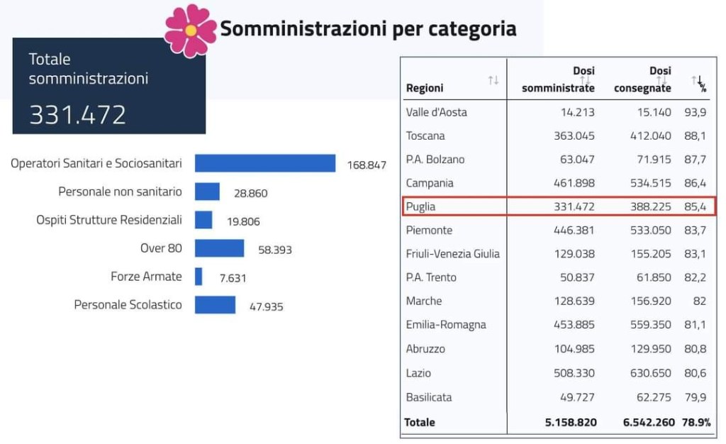 Abbiamo somministrato oltre l’85% dei vaccini ricevuti. Per usare la scorta del 30% (che abbiamo ridotto al 15%), quella da conservare per le seconde dosi, si sta facendo un lavoro certosino di programmazione delle seconde dosi. Siamo fra le regioni italiane che sta utilizzando più velocemente tutte le consegne.