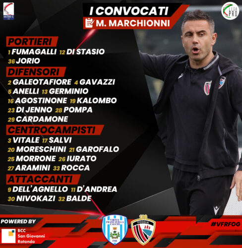 Una gara importante per i rossoneri, che dovranno mettere in campo le giuste motivazioni come confermato dal tecnico dei satanelli “Affrontiamo una buona squadra, ben messa in campo e con motivazioni importanti, le stesse dobbiamo averle noi – ha commentato Marchionni – c’è da riscattare una prestazione non all’altezza, non possiamo permetterci di scendere in campo con un atteggiamento sbagliato come fatto con la Cavese. Grinta, determinazione e semplicità, dobbiamo tornare ad essere il Foggia. I playoff? Dipende sempre e solo da noi, lo dico sempre e lo ripeterò fino all’ultima giornata di campionato. Formazione? Devo dosare le forze, abbiamo due gare ravvicinate ed è chiaro che avendo una rosa ampia, posso considerare di far riposare qualcuno che ha bisogno di recuperare energie e condizione. Vediamo domani”.