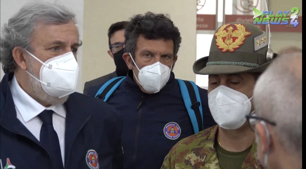 Il Presidente della Regione Puglia Michele Emiliano, dopo gli incontri di lavoro nella sede del Consiglio regionale, ha accompagnato il Commissario Straordinario per l’emergenza Covid 19 Generale di Corpo d’Armata F. P. Figliuolo e Capo Dipartimento Protezione Civile Ing. Fabrizio Curcio nell’Aula del Consiglio regionale a visitare le strutture sanitarie realizzate all’interno della Fiera del Levante. Insieme alle delegazioni nazionali anche l’Assessore Sanità e benessere animale Pierluigi Lopalco e il Dirigente Protezione Civile Regione Puglia Mario Lerario, il Capo di Gabinetto Presidenza Giunta, Claudio Stefanazzi e il Vice Capo di Gabinetto Presidenza Giunta, Domenico De Santis.