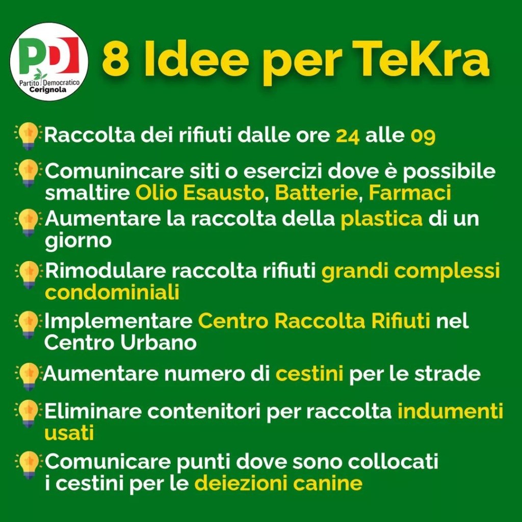 Queste otto idee iniziali, potrebbero migliorare e sensibilizzare la città alla raccolta differenziata, che ricordiamo essere uno strumento fondamentale per un futuro abbassamento del costo della Tari ma anche per una migliore vivibilità della nostra città oltre che ad un apporto di benefici ambientali, comuni, enormi.