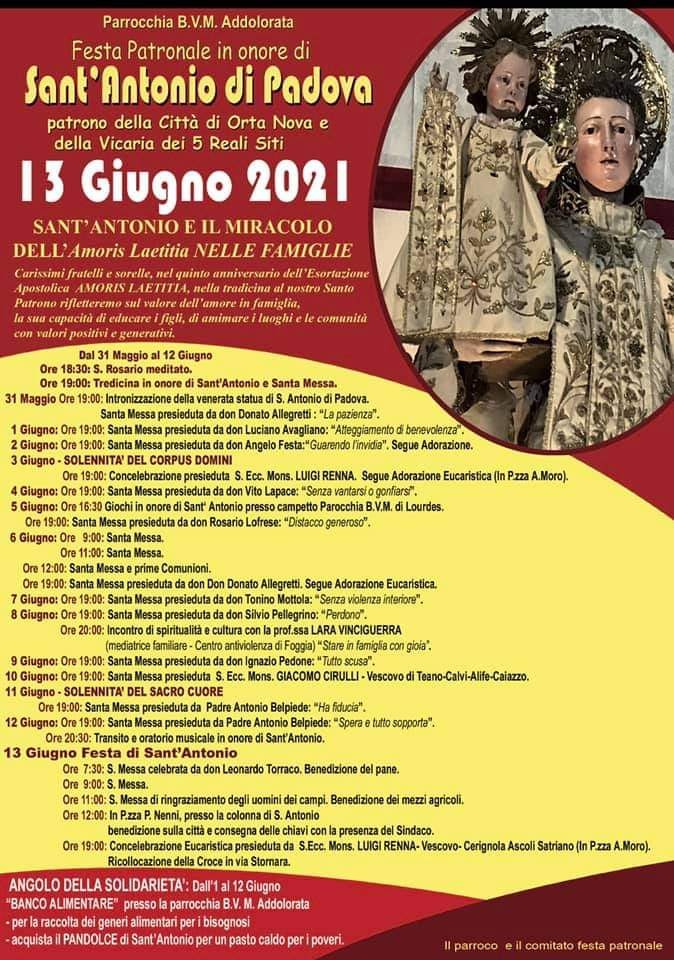 Domani invece le celebrazioni religiose con la consegna delle chiavi della città a Sant’Antonio, presso l’obelisco in Piazza Nenni, e la ricollocazione della Croce dei Cappuccini, recentemente valndalizzata, a seguire la SS Messa che si svolgerà all’aperto e sarà celebrata dal Vescovo Luigi Renna. Di seguito il programma completo delle celebrazioni.