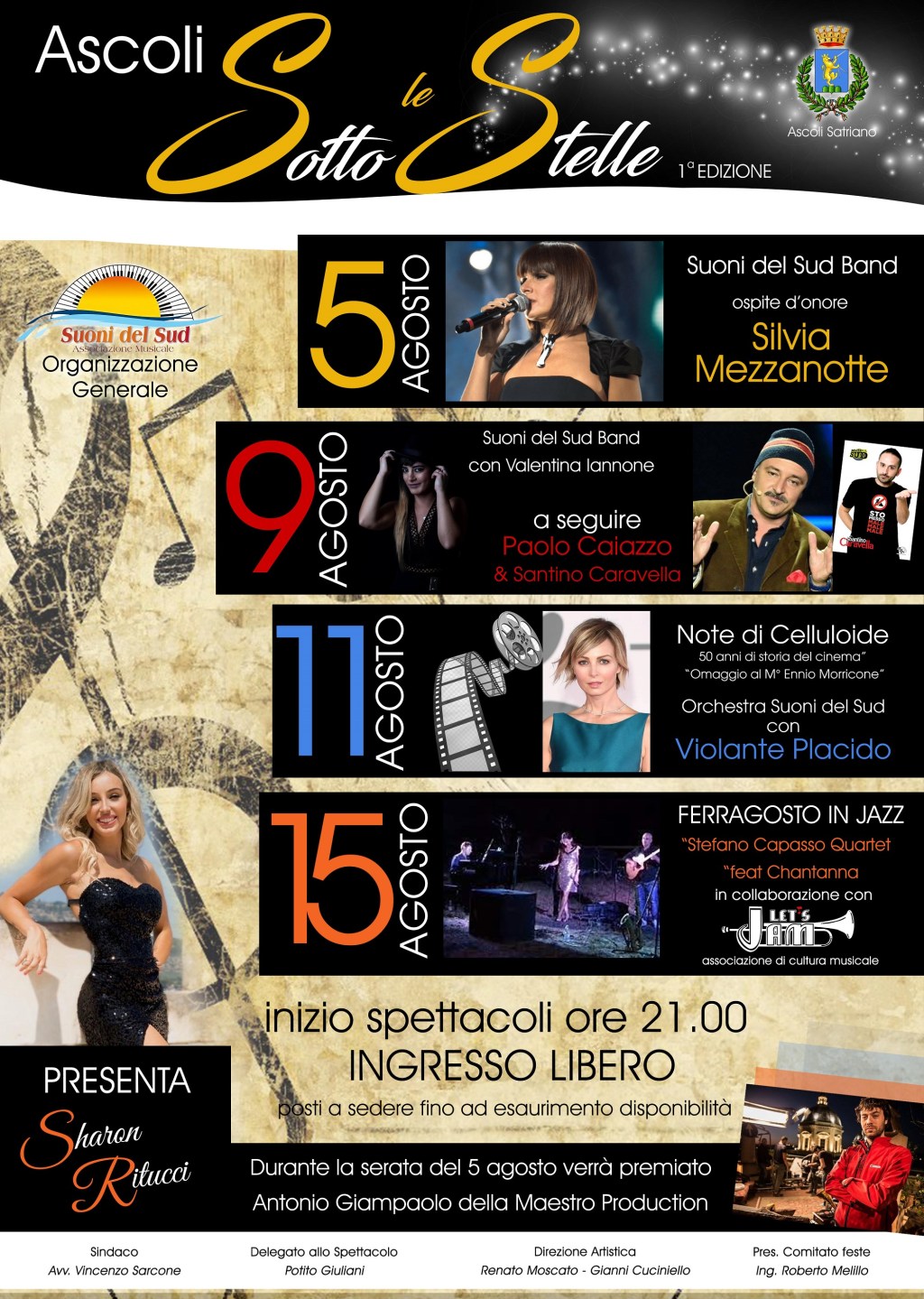 Il primo appuntamento, quello del 5 agosto, vedrà esibirsi la Suoni del Sud Band con Silvia Mezzanotte quale ospite d’onore. Nel corso della serata verrà premiato Antonio Giampaolo della Maestro Production.