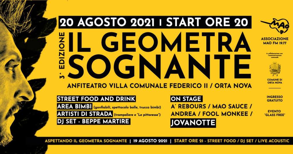 È tutto pronto per la terza edizione del Geometra Sognante, organizzato dall’Associazione Mao 19.77, che ricorderà questa sera Maurizio Ferrandina, indimenticato protagonista della scena rock di capitanata. L’evento si terrà presso l’anfiteatro della Villa Comunale Federico II, dove cinque band suoneranno dal vivo per ricordare il geometra musicista scomparso nel 2018. Sul palco saliranno gli A’ Rebours, i Mao Souce, Andrea, i Fool Monkee e i Jovanotte, il tributo ufficiale italiano a Lorenzo Jovanotti Cherubini. Un evento che sarà affiancato da uno street food and drink nel segno del glass free, oltre ad aree attrezzate per i più piccoli e all’arte, con gonfiabili ed artisti di strada.