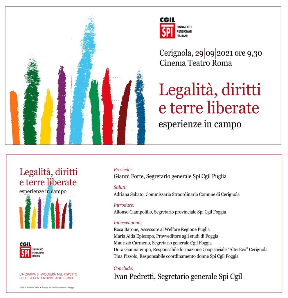 Ci saranno anche Ivan Pedretti, segretario generale dello SPI Cgil nazionale; l’assessore al Welfare della Regione Puglia, Rosa Barone; e la Commissaria straordinaria del Comune di Cerignola, Adriana Sabato, all’evento organizzato dal Sindacato Pensionati della Cgil per presentare risultati e prospettive delle esperienze in campo in tema di “Legalità, diritti e terre liberate”. Mercoledì 29 settembre, alle ore 9.30, al Cinema Teatro Roma di Cerignola, si farà il punto sul percorso intrapreso nella città più importante del Basso Tavoliere e le prossime iniziative che, partendo dalla confisca e nel riutilizzo in chiave sociale dei terreni e dei beni confiscati alle mafie, sta costruendo prospettive di integrazione, produzione etica, diritti e lavoro per il territorio.