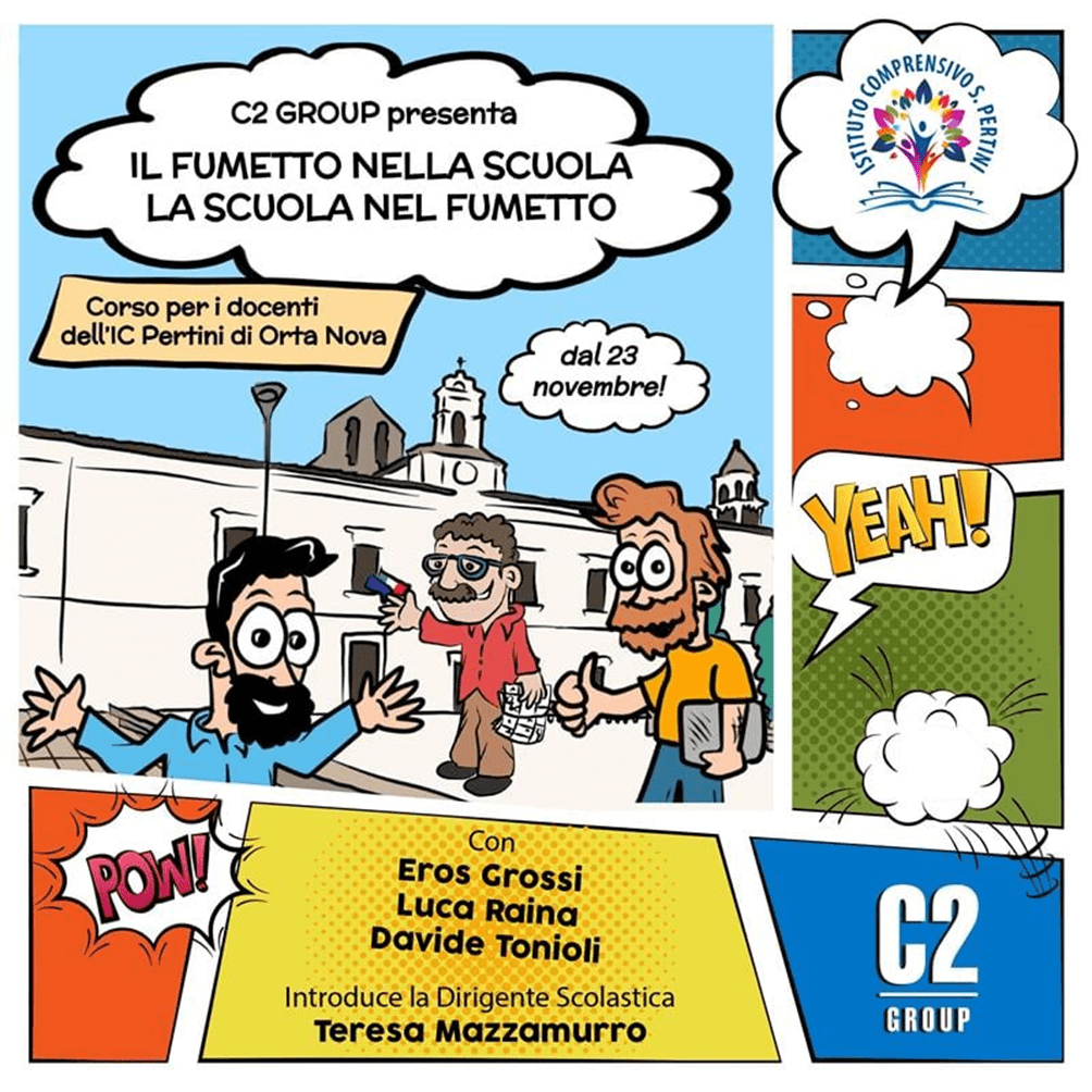 Il 23 novembre 2021 l’Istituto Comprensivo “Sandro Pertini” di Orta Nova (FG) avrà il piacere di ospitare al corso di formazione organizzato dalla C2 GROUP un trio di eccezione Eros Grossi, Luca Raina e Davide Tonioli. Il corso è un importante appuntamento di formazione tra pari, reso possibile dalla grande capacità organizzativa della Dirigente Scolastica Prof.ssa Teresa Mazzamurro, in cui i docenti sperimenteranno nuove strategie didattiche supportate dalle TIC e avranno modo di diffondere le proprie buone pratiche. Davide Tonioli, fumettista “a tempo libero” (come Davide stesso ama definirsi) e “di mestiere”, responsabile di Fidenia, (un social learning italiano, molto diffuso nelle scuole), terrà insieme a Luca Raina, innovatore ed esperto di tecnologia applicata alla didattica, noto come professore della serie televisiva di Rai Due “Il Collegio” e Eros Grossi, docente esperto di apprendimento multimediale e design didattico attivo con la rubrica Rai Scuola, Pearson Italia e con la rivista Briks un workshop dedicato all’uso dei fumetti nella didattica.