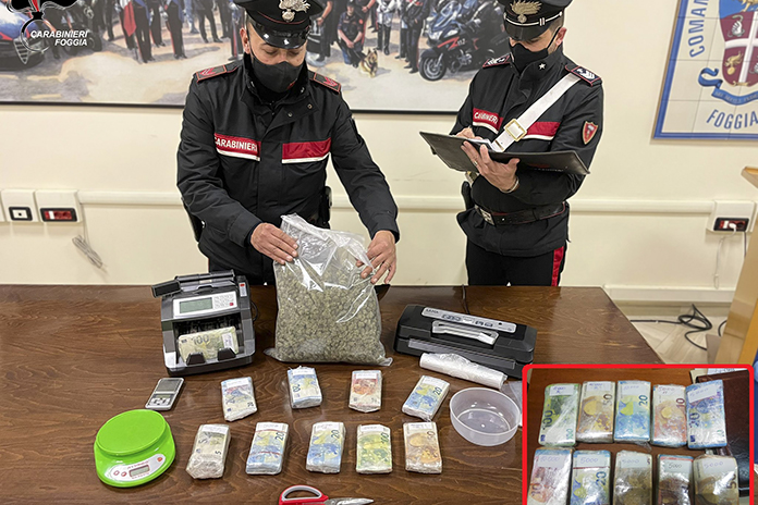 Continua è l’attività dei carabinieri della Compagnia di Foggia finalizzata a contrastare il fenomeno della detenzione ai fini di spaccio di sostanze stupefacenti. Questa volta a finire nella “rete” dei controlli d’iniziativa da parte dei carabinieri del Nucleo Operativo e Radiomobile, è stato un 30enne originario del capoluogo dauno, già noto alle Forze dell’Ordine, che,nel procedere a velocità sconsiderata lungo la SS16 in direzione Cerignola a bordo della sua Alfa Romeo Giulietta, ha insospettito non poco i militari dell’Arma che, dopo aver raggiunto il veicolo, hanno proceduto al controllo del conducente e del mezzo, rinvenendo 70.000 euro in banconote di vario taglio nel vano airbag anteriore destro. Il controllo è stato esteso anche all’abitazione dell’uomo, dove è stato rinvenuto 1kg di sostanza stupefacente del tipo marijuana, vario materiale utilizzato per il confezionamento e il peso della suddetta sostanza e una macchina elettronica per contare le banconote, tutto sottoposto a sequestro penale.