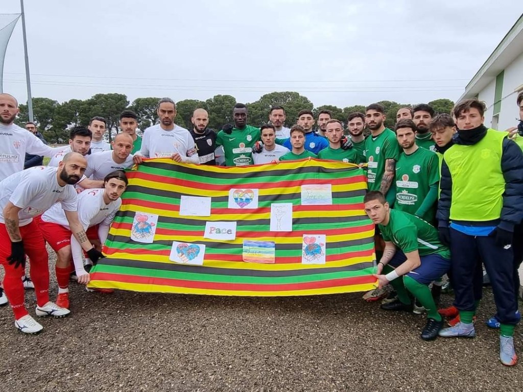 Anche il campionato di Eccellenza pugliese è sceso in campo per la pace, è successo al San Rocco di Stornara nel match tra Real Siti e la capolista Barletta. Le due formazioni sono scese in campo con uno striscione a sostegno della pace, sulla quale sono stati incollati alcuni disegni dei bambini della cittadina dei Reali Siti. In campo la vittoria è andata alla formazione di Mr. Mimmo Farina, che con una doppietta di Pignataro allunga a più sette sul Corato, fermato in casa dal Mola. Cade pesantemente in casa il Vieste contro il Di Benedetto Trinitapoli, i garganici rischiano ora di essere coinvolti nella lotta per la salvezza, vittoria importante per il Borgorosso Molfetta, che supera due a zero il San Marco, mentre è pari tra Unione Calcio Bisceglie e Manfredonia, poker esterno del San Severo in casa del Trani. Non sono scese in campo invece Canosa e Orta Nova, con la formazione biancoazzurra, ancora alle prese con diversi casi Covid-19.