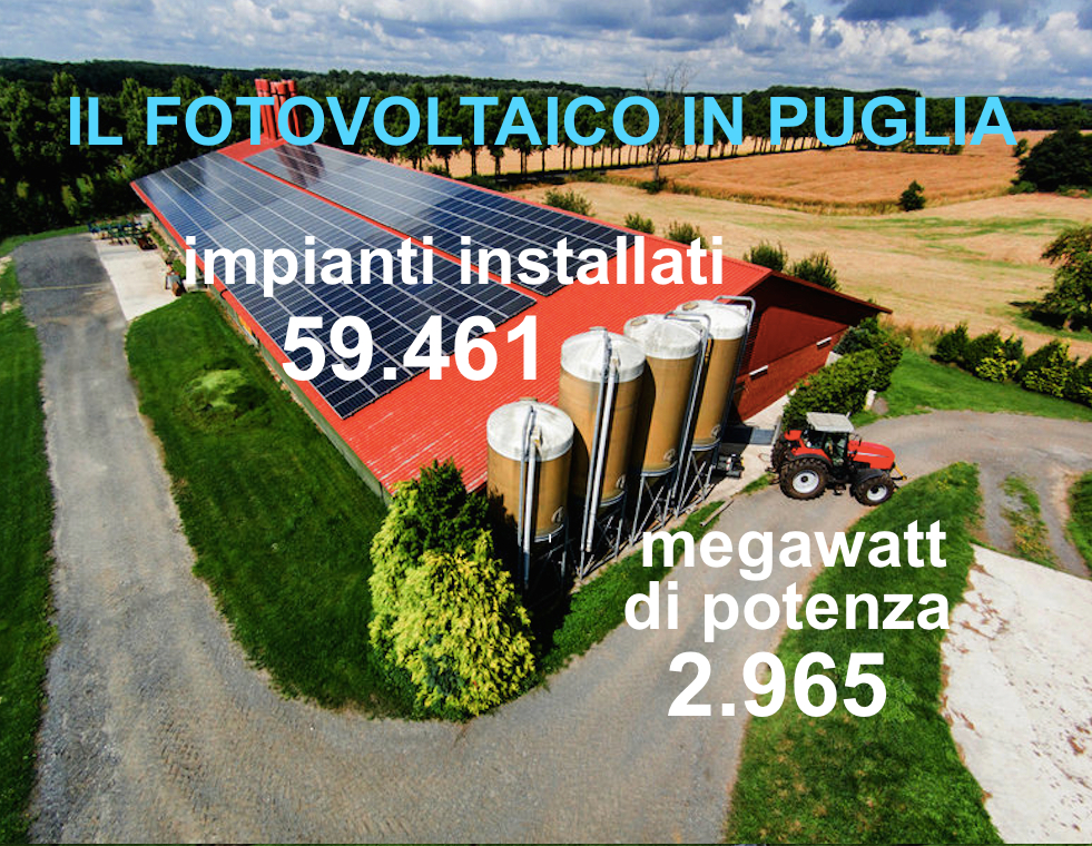 La Puglia, per quanto riguarda l’energia prodotta dalla fonte solare, con i suoi 59.461 impianti sui complessivi 1.024.242 installati in tutta Italia, è la prima regione per potenza (2.965 megawatt). Seguono Lombardia (2.734), Emilia Romagna (2.279), Veneto (2.215), Piemonte (1.792), Sicilia (1.536), Lazio (1.505), Marche (1.149). Le altre regioni non raggiungono i mille megawatt di potenza, in base all’elaborazione dell’Osservatorio Economico di CIA Puglia su dati Terna.