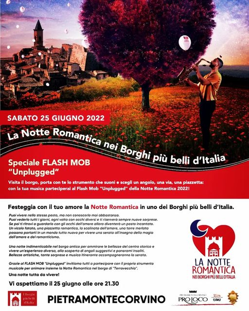 Il filo rosso che connette tutti gli eventi è il flash mob “Unplugged”: chiunque suoni, per professione o per passione, e abbia voglia di esibirsi non ha da fare altro che arrivare a Pietramontecorvino con il proprio strumento e chiedere di poter allietare la serata dei visitatori romantici.