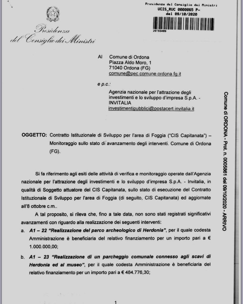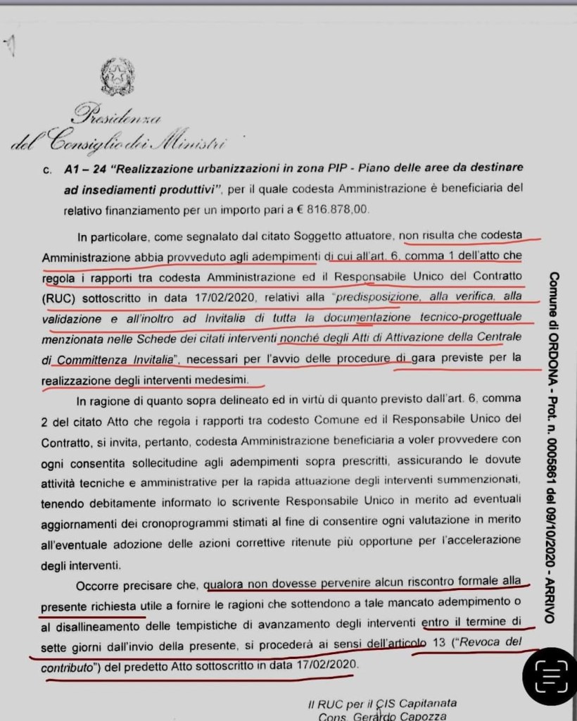 Comune di Ordona ha ricevuto una lettera dalla Presidenza del Consiglio dei Ministri che rilevava il mancato invio di tutta la documentazione richiesta dal contratto, avvertendolo che, in caso di mancato riscontro entro 7 giorni, tutti i finanziamenti sarebbero stati revocati.