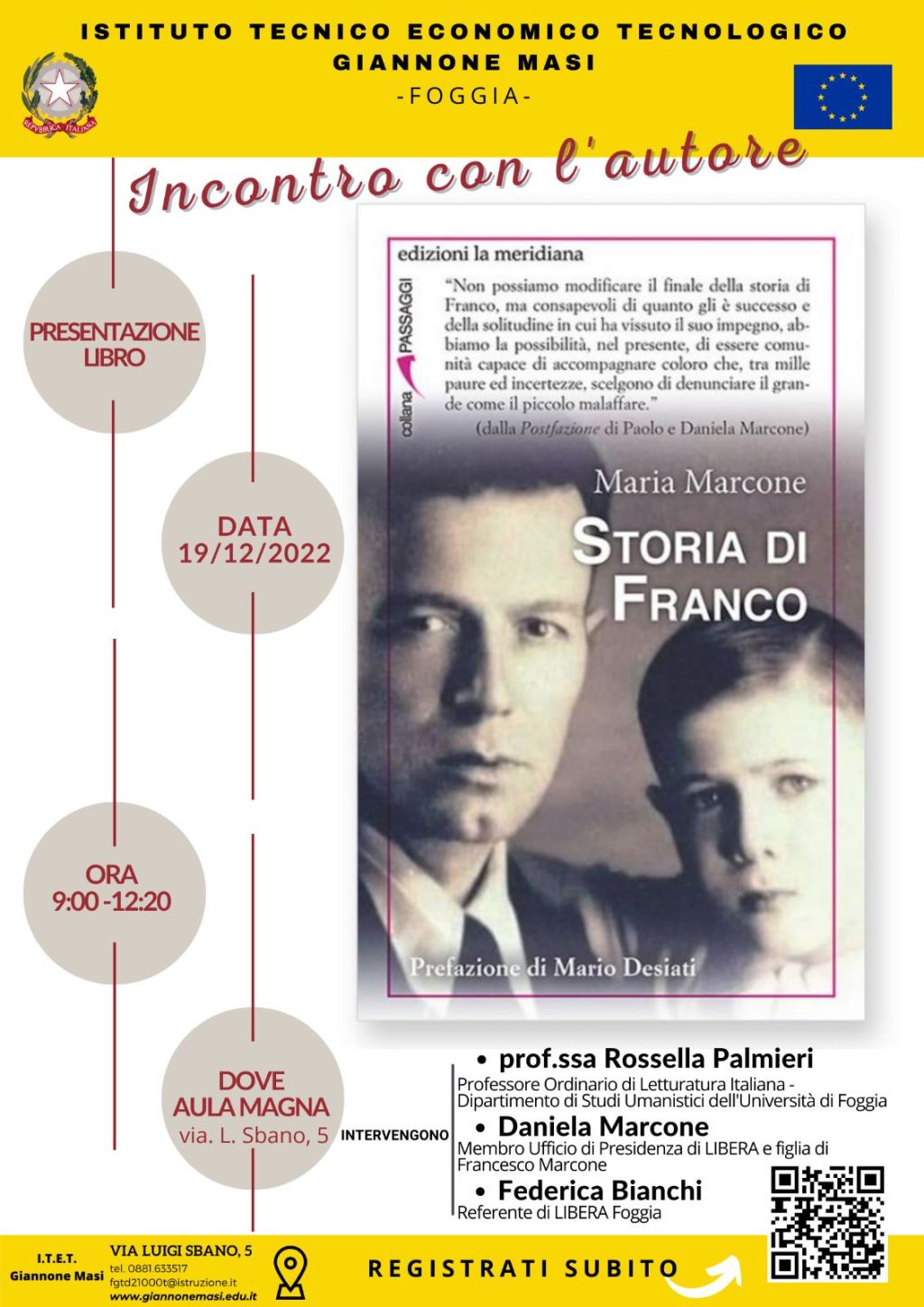 L’istituto Giannone-Masi ripercorre la triste vicenda dell’assassinio di Francesco Marcone, direttore dell’ufficio del registro ucciso dalla mafia il 31 marzo 1995. Lunedì 19 dicembre alle 9, infatti, nell’aula magna dell’istituto in via Sbano, sarà presentato “Storia di Franco”, il libro di Maria Marcone che in realtà non è la cronaca dell’omicidio, ma di un romanzo di formazione tra infanzia e adolescenza, in cui ritrovare le radici della tenacia e del coraggio che hanno poi condotto Franco ad affrontare le scelte complesse della cui portata siamo stati consapevoli solo dopo la sua morte.