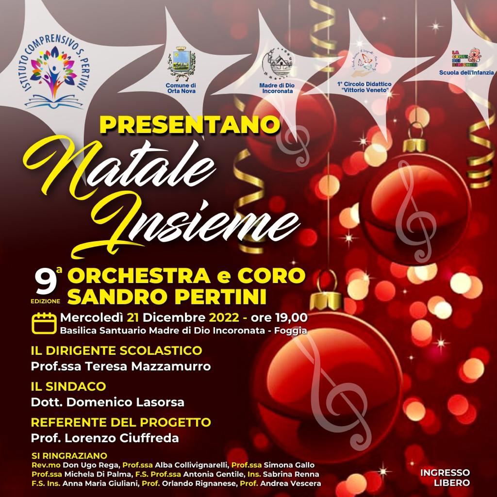 In occasione delle festività natalizie l’Istituto Comprensivo “S. Pertini” con la collaborazione del 1° Circolo Didattico “Vittorio Veneto” e della Scuola dell’Infanzia La Corte dei Birichini di Orta Nova presenta il concerto Natale Insieme, per diffondere attraverso il canto il più tradizionale spirito natalizio. Il percorso musicale intrapreso ha visto coinvolti gli alunni della scuola dell’Infanzia, delle classi quinte della scuola Primaria, della scuola secondaria e gli alunni della Scuola la Corte dei Birichini nella formazione del coro, accompagnati dall’Orchestra Giovanile Sandro Pertini dell’Istituto Comprensivo.