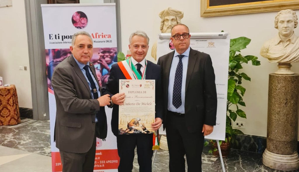 Il sindaco di Carapelle, Umberto Di Michele, ha ricevuto questa mattina a Roma, al Campidoglio, il diploma di merito e riconoscimento del Parlamento della Legalità Internazionale e della Onlus “E ti porto in Africa”. Il riconoscimento è stato consegnato a Di Michele ‘per il costante impegno socioculturale in difesa dei veri valori della vita’. “È un premio che mi rende felice e che voglio condividere con la mia amministrazione e soprattutto col mio paese – ha detto il primo cittadino di Carapelle – visto che il riconoscimento riguarda il nostro operato in questi cinque anni. Sono orgoglioso di questo attestato di stima e ringrazio di cuore Vincenzo Mallamaci e Niccolò Mannino, a capo della onlus e del Parlamento, che mi hanno concesso questo enorme privilegio”.