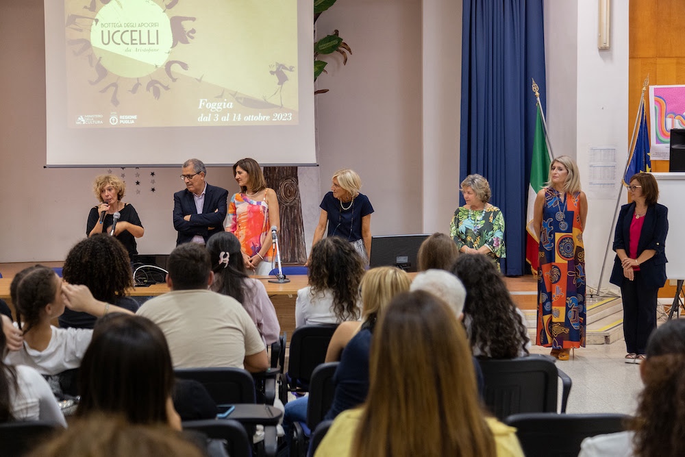 Venerdì 29 settembre nell’auditorium dell’Istituto Tecnico “Notarangelo-Rosati” è stato presentato il progetto “Uccelli” a Foggia – realizzato dal Comune di Foggia, in sinergia col Teatro Pubblico Pugliese, in collaborazione con Parcocittà e con quattro Istituti scolastici – che partirà il 3 ottobre. Sono previsti dieci giorni di pratica teatrale e durante gli ultimi tre saranno a Foggia anche i ragazzi di Manfredonia e di Corato, dove lo spettacolo è andato in scena il 28 settembre scorso.