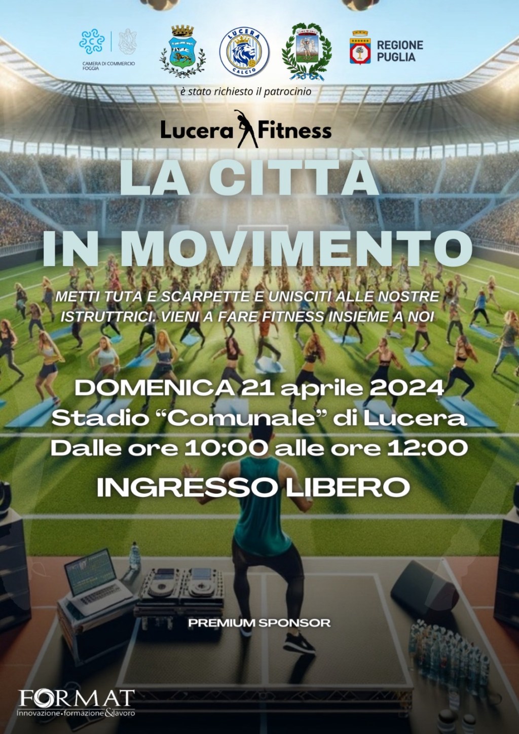 Si terrà domenica 21 aprile dalle 10 alle 12 allo stadio comunale di Lucera (ingresso libero) l’evento “La città in movimento”, manifestazione dedicata al fitness e organizzata dall’ente di formazione Format con l’Asd Lucera Calcio e patrocinato dal Comune di Lucera, dalla Provincia di Foggia, dalla Regione Puglia e dalla Camera di Commercio di Foggia.