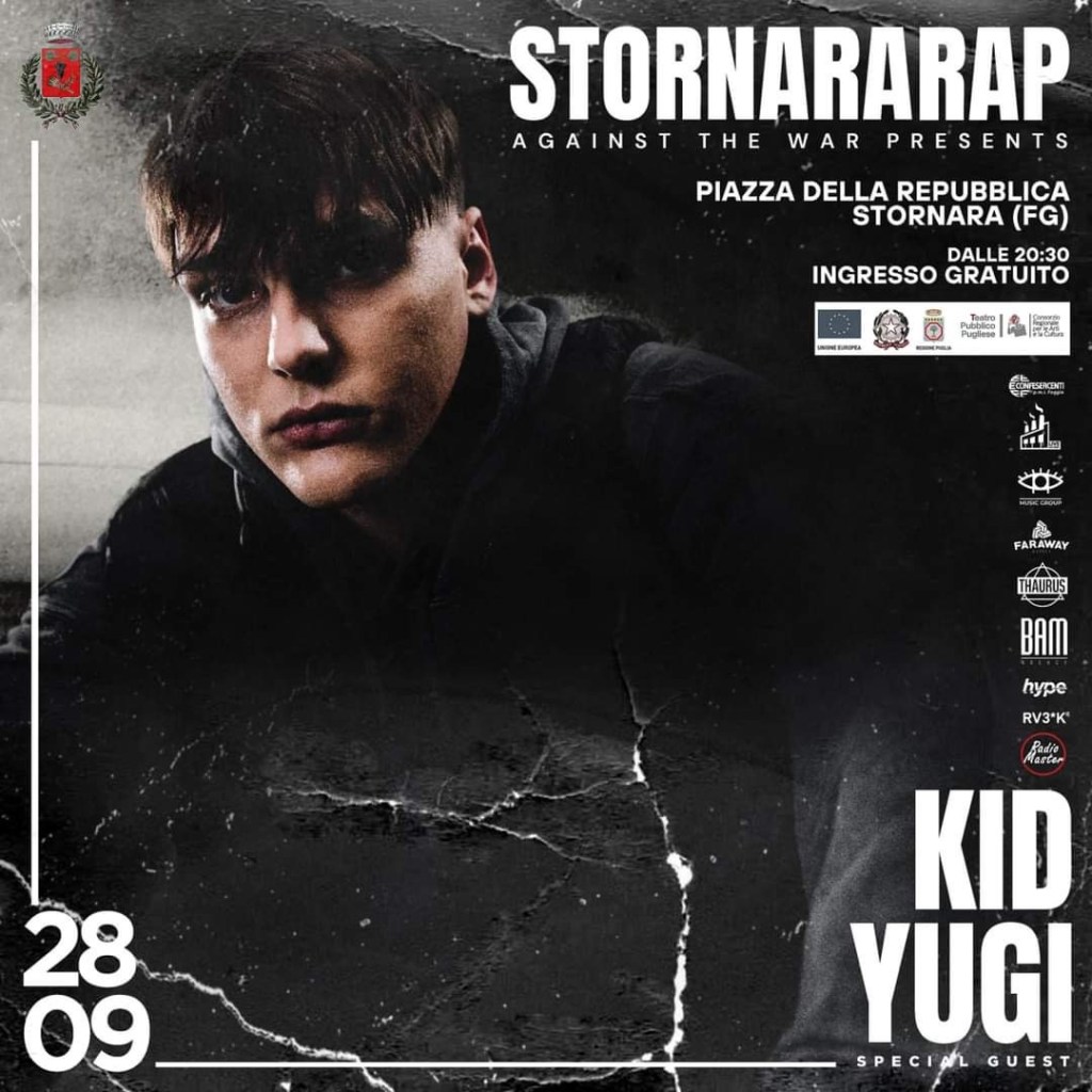 Lo Stornara rap against the war del Comune di Stornara è l’unico festival hip hop riconosciuto e finanziato dalla regione puglia, nato come stornarap nel 2012 ormai ha una tradizione più che decennale e ha portato a stornara il top degli artisti hip hop italiano: Clementino, Guè, Salmo, Shaggy, Rocco Hunt, Luche e tanti altri quest’anno porterà l’artista del momento Kid Yugi. Per la prima volta collaborerà con il festival di street art più importante del sud Italia: Stramurales un progetto ambizioso che ha già portato a Stornara decine di artisti internazionali. Il 28 settembre comunica l ‘ amministrazione comunale sarà per Stornara una giornata di festa e arte a partire dalla mattina con il Contest di beatmaking per la prima volta organizzato in capitanata e uno dei primi in Italia, 5 produttori si sfideranno con vinili, campionatori e giradischi, nel frattempo nei muri della città disegneranno l’ artista argentino Alaniz e i foggiani Maxel art e Johnny soend, già dalla mattina presso Tannico faremo dj set con i dj Roby il produttore di musica reggae Tuff we tuff, dfonq e live beatmaking di k9 e FruitBat.