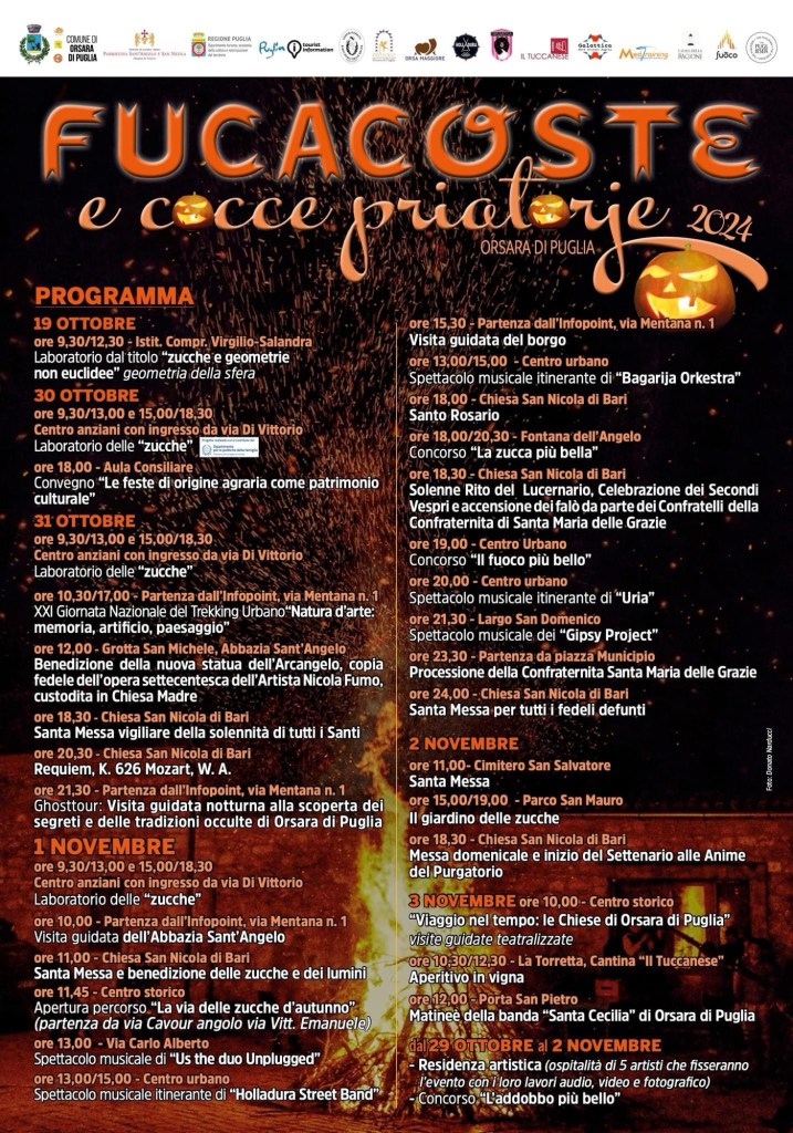 E’ tutto pronto ad Orsara di Puglia per accogliere anche quest’anno migliaia di visitatori per l’edizione 2024 di Fucacoste e Cocce Priatorje, la secolare tradizione che vede le famiglie orsaresi riunirsi in casa accendendo dei falò’, ed esponendo davanti alle proprie abitazioni delle zucche intagliate ed illuminate, per permettere alle anime dei defunti di ricongiungersi ai propri familiari.