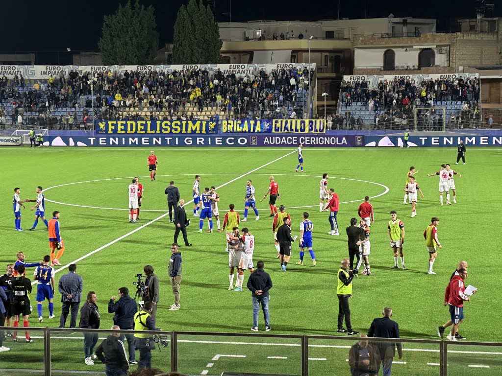 Il sorpasso al Benevento sfuma sul più bello, finisce uno a uno la sfida del Monterisi tra Audace Cerignola e Crotone, con il vantaggio degli ofantini al 41’ con Jallow servito da Tentardini, ed il pari di Giron con una gran conclusione dalla distanza al 71’. Nel finale il Cerignola resta in dieci per la doppia ammonizione subita da Capomaggio ed una ghiotta occasione nel recupero sui piedi di Sain-Maza con la straordinaria parata di Sala.