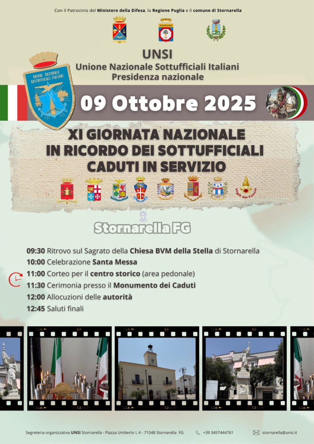 L’Unione Nazionale Sottufficiali Italiani – Presidenza Nazionale, in collaborazione con la Sezione UNSI di Stornarella, presieduta dal 1* Mar.Lgt.(ris)dr. Antonio Maffione, annuncia che giovedì 9 ottobre 2025, a Stornarella (FG), si terrà la XI Giornata Nazionale in Ricordo dei Sottufficiali Caduti in Servizio.