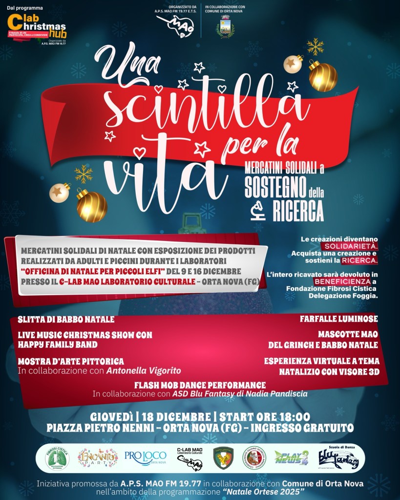 L’associazione MAO FM 19.77 accende il Natale con un’iniziativa che unisce creatività, partecipazione e solidarietà: “Una Scintilla per la Vita — Mercatini solidali a sostegno della Ricerca”. L’evento rientra nel programma del “C-Lab Christmas Hub”: una serie di appuntamenti ad ingresso gratuito, organizzati e programmati da APS MAO FM 19.77 nell’ambito del “Natale Ortese 2025”, iniziativa promossa dal Comune di Orta Nova. Un calendario che accompagna la comunità per tutto il mese di dicembre, con proposte variegate: dai laboratori creativi alla live music, fino a rassegne letterarie con dialoghi e confronti aperti a tutta la cittadinanza.