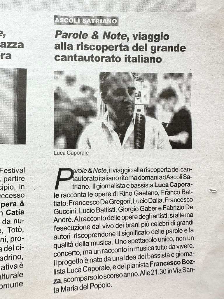 “Parole & Note” è un racconto in musica che nasce da un’idea del giornalista e bassista Luca Caporale e del pianista Francesco Bozza. Uno spettacolo innovativo, che alterna monologhi in cui Luca Caporale, attraverso aneddoti, testi e storie, racconta gli autori, a momenti di musica dal vivo, in cui la band ripropone i grandi classici della discografia degli artisti.